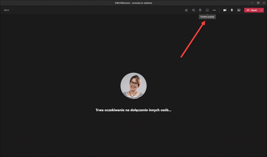 Gdy zakładasz spotkanie poprzez kalendarz w Teams, to twój wirtualny pokój zyska nową ikonę, która pozwoli Ci podział uczestników na grupy.